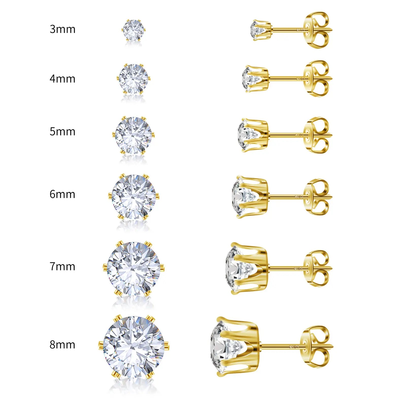 3mm( 0.2cttw ), 4mm( 0.6cttw ), 5mm( 1.0cttw ), 6mm( 1.6cttw ), 7mm( 2.0cttw ), 8mm( 4.0cttw ), 🔥A Set( 6 Pairs of all size ) |
