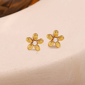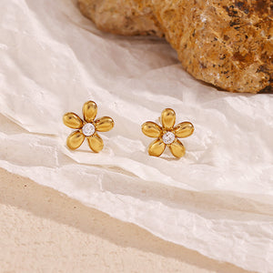Introducing the Floralia Earrings. beautifully crafted with minimal flower design and adorned with a stunning stone at the center. Made with 18k gold plating. these earrings are anti-tarnish and waterproof for long-lasting wear. Elevate your look with these elegant and durable earrings.