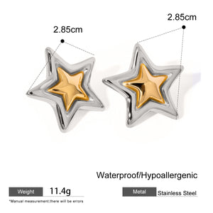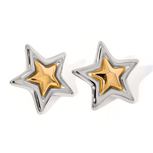 Elevate your style with the Gilded Star Earrings. featuring a striking star design crafted with 18k gold plating for lasting brilliance. These dual-tone earrings resist tarnish and are waterproof. ensuring durability and effortless maintenance. Perfect for adding a refined. celestial touch to any outfit while maintaining expert-level quality and wearability.