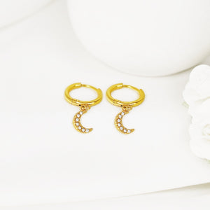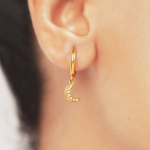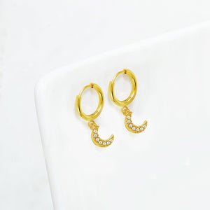 Enhance your style with our Lunar Radiance Earrings. The lunar charm design adds a minimal touch. 18k gold plating ensures anti-tarnish. and waterproof qualities add durability. Elevate your look and make a lasting impression.
