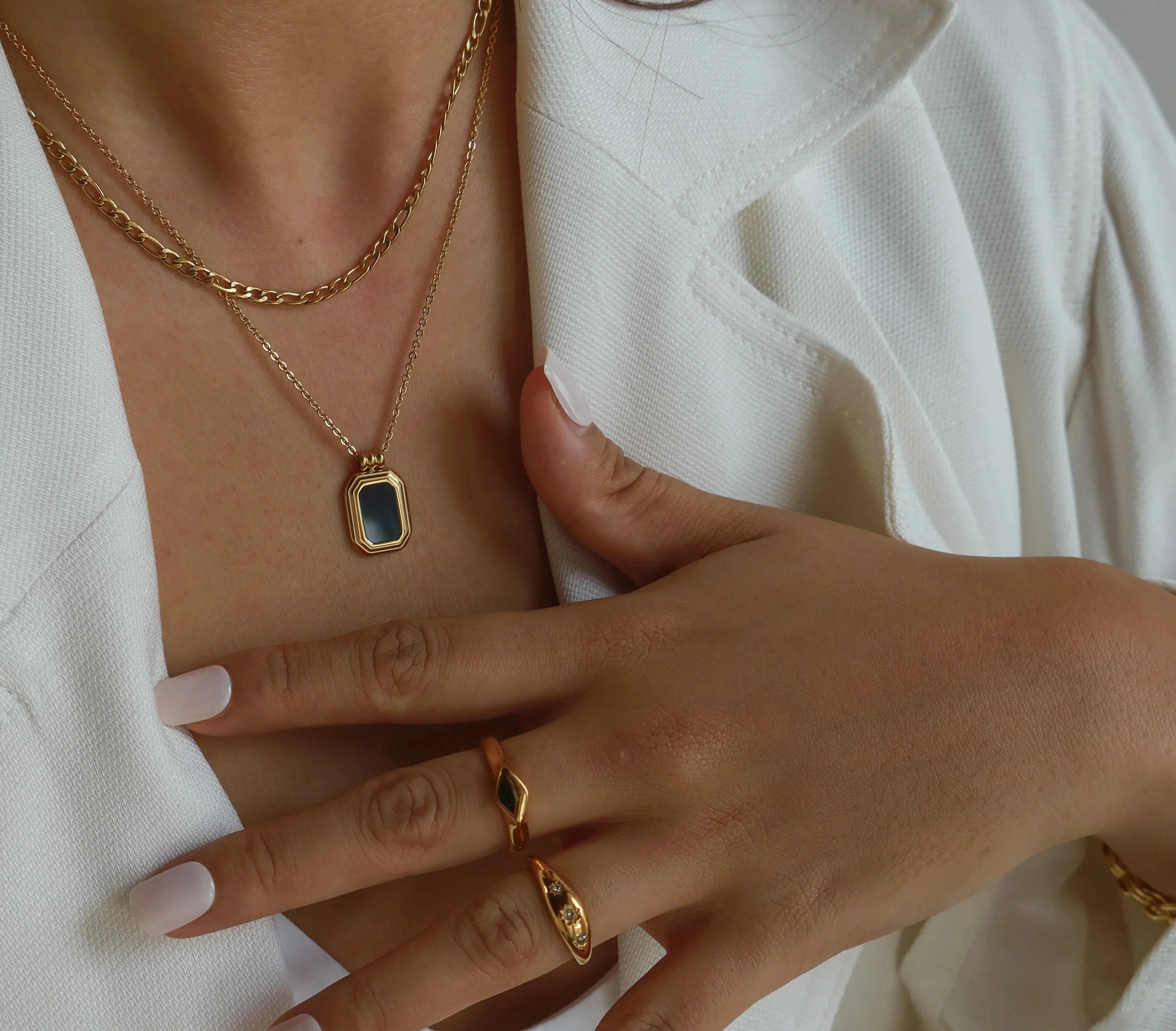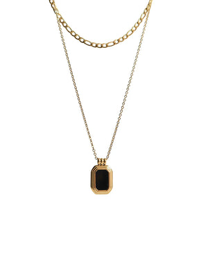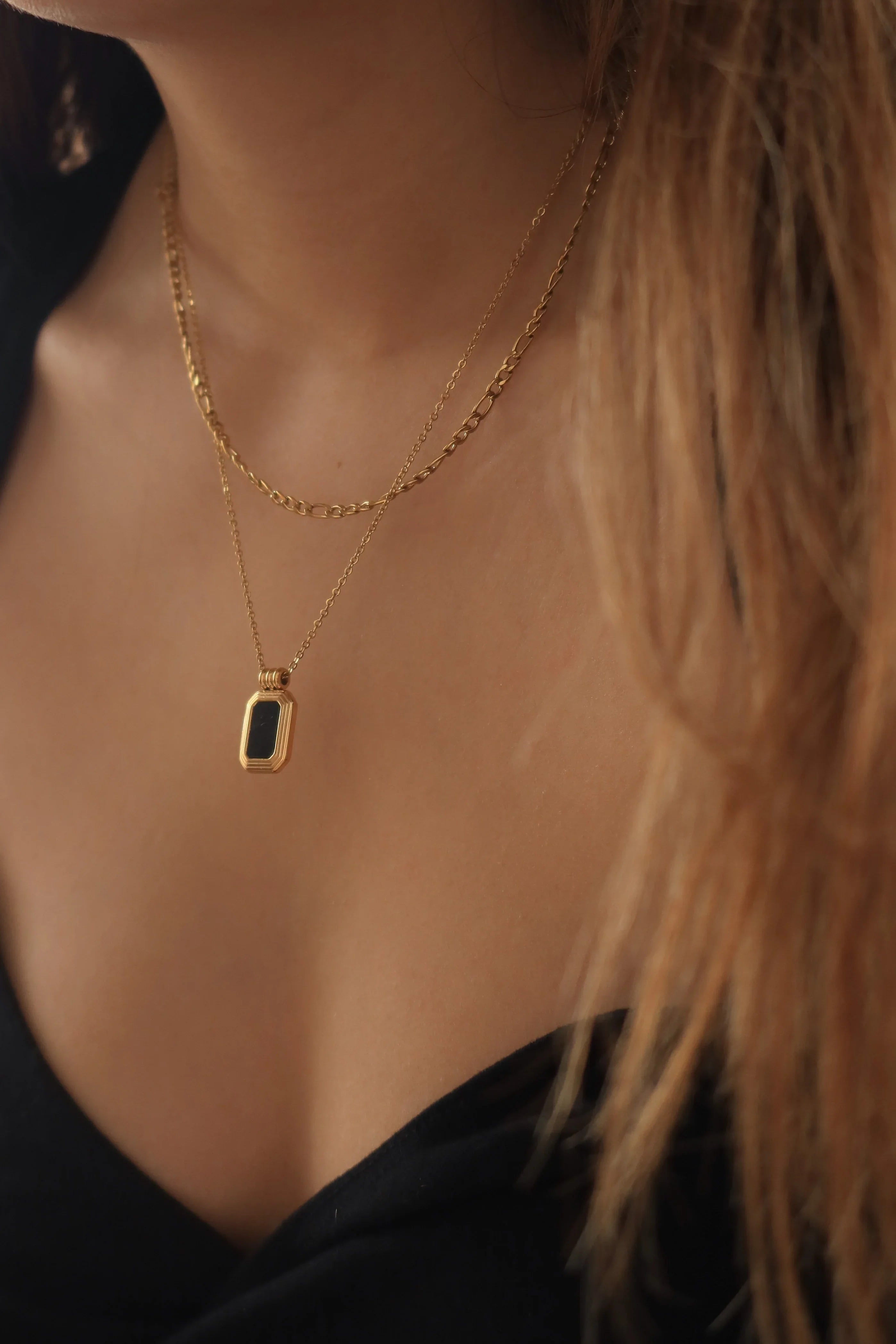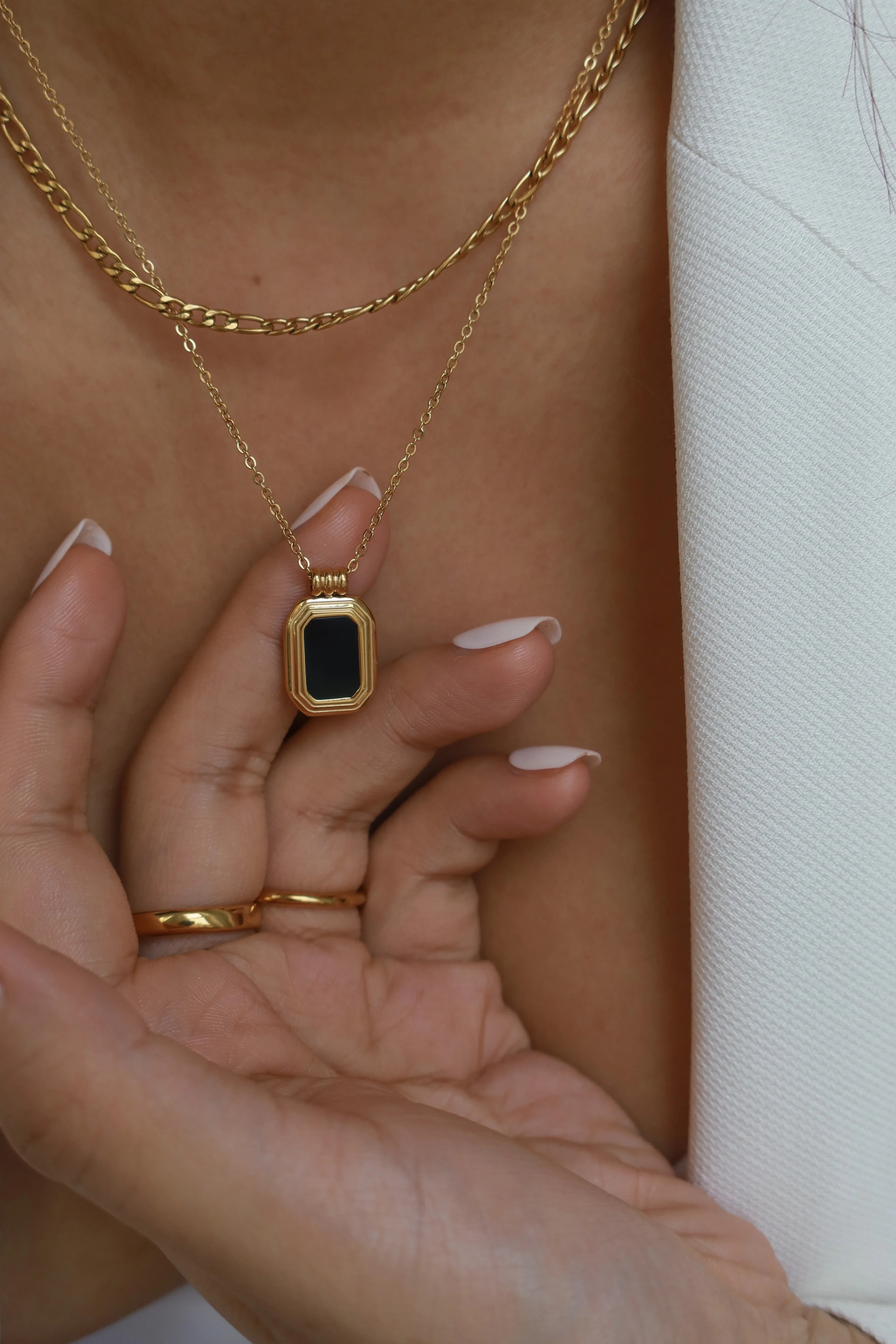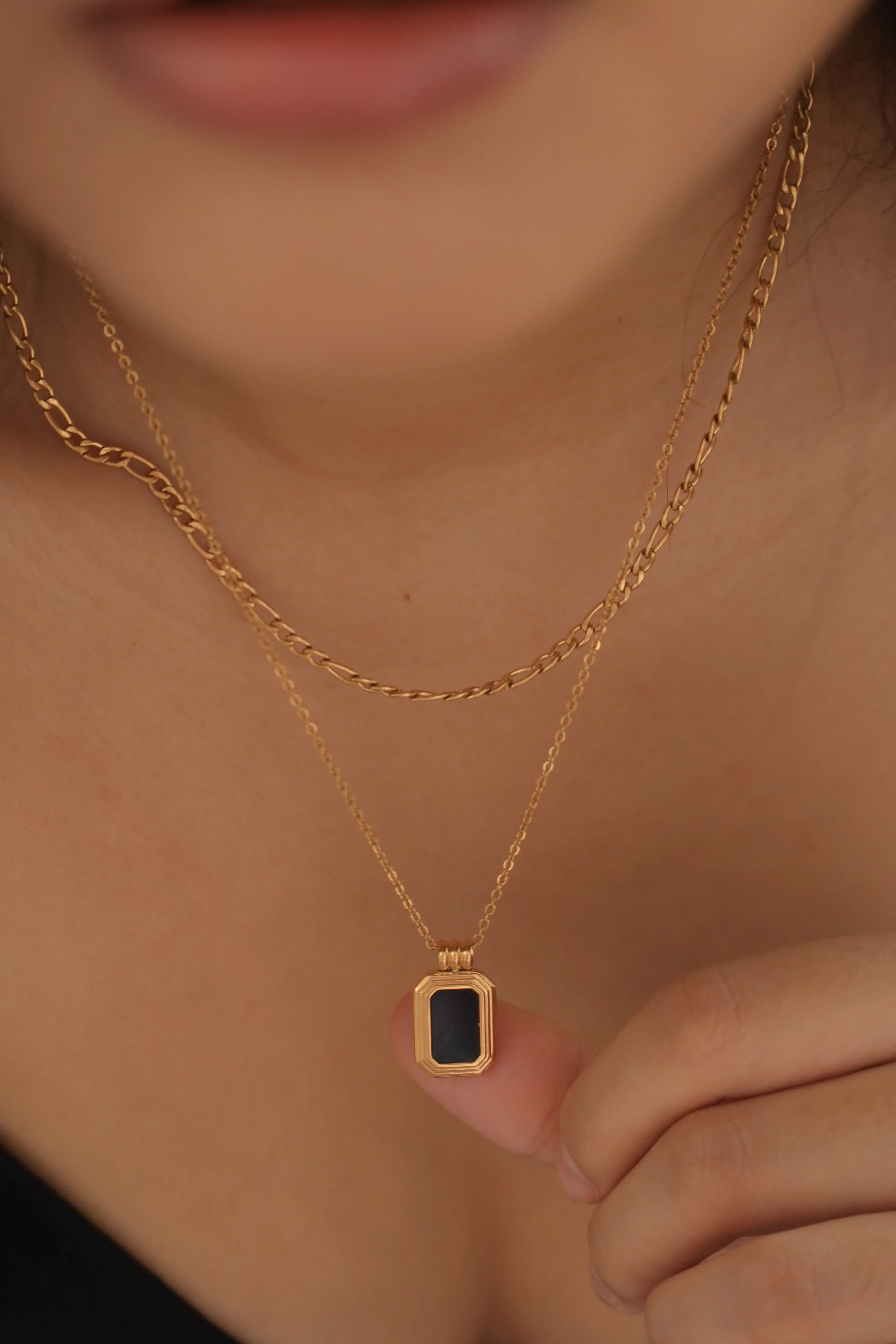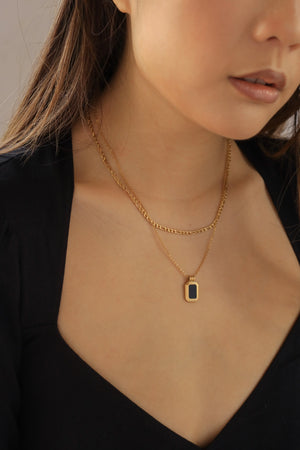 Elevate your date night look with our Midnight Double Layered Necklace. Featuring a black enamel charm and two layers of delicate. 18k gold-plated chains. this necklace adds an elegant touch to any outfit. As an added bonus. it is also waterproof. making it the perfect accessory for any occasion.