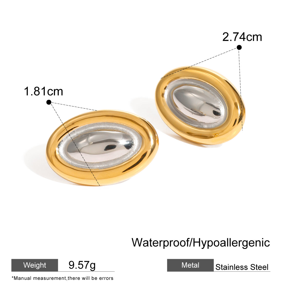 Oval Muse Earrings feature an elegant oval shape with a sophisticated dual-tone finish. expertly plated in 18k gold. Engineered to resist tarnish and water. these earrings offer lasting shine and durability. making them a refined accessory for any occasion.