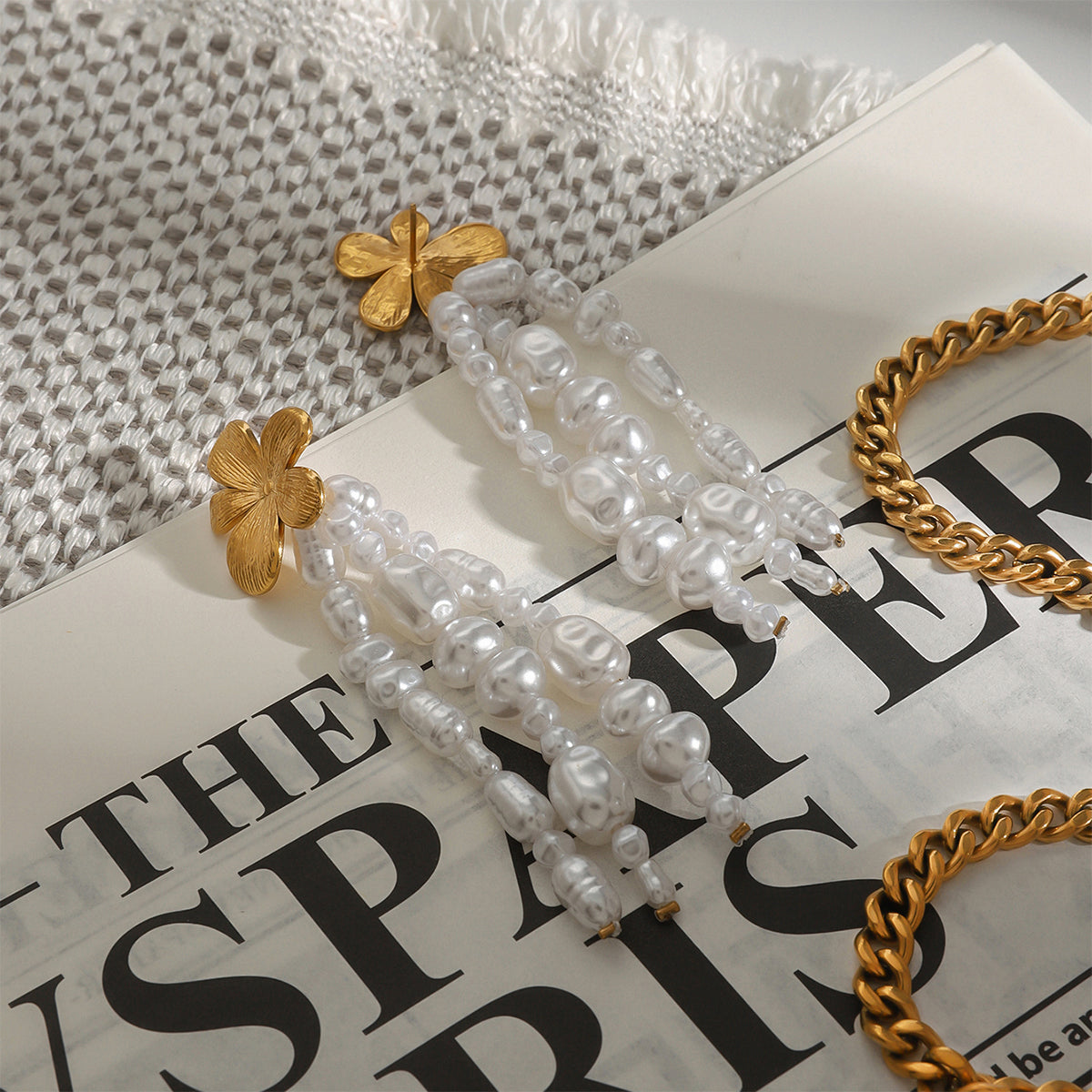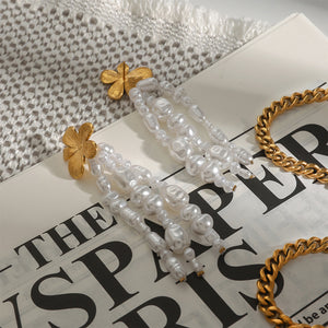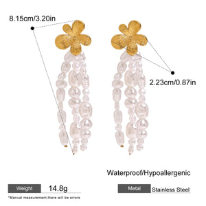 Elevate your elegance with the Petal Pearl Drop Earrings. featuring delicate flower designs adorned with lustrous pearl drops. Crafted with 18k gold plating. these earrings offer lasting shine and resistance to tarnish. Their waterproof quality ensures durability for everyday wear. making them a sophisticated and reliable accessory for any occasion.