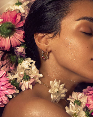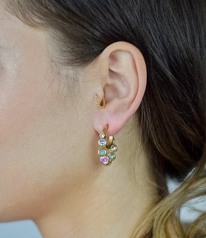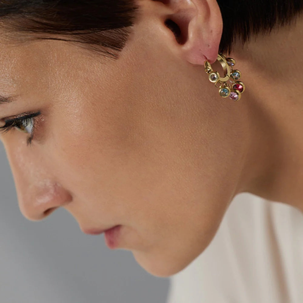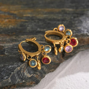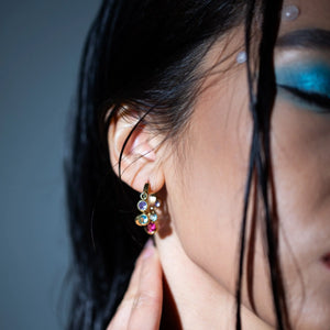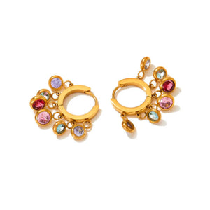 Add a pop of color to your outfit with our Rainbow Shimmer Earrings! Designed with rainbow stones that dangle and shimmer. these earrings are also waterproof and 18k gold plated for durability and long lasting shine. Elevate your style with these eye-catching and versatile earrings.