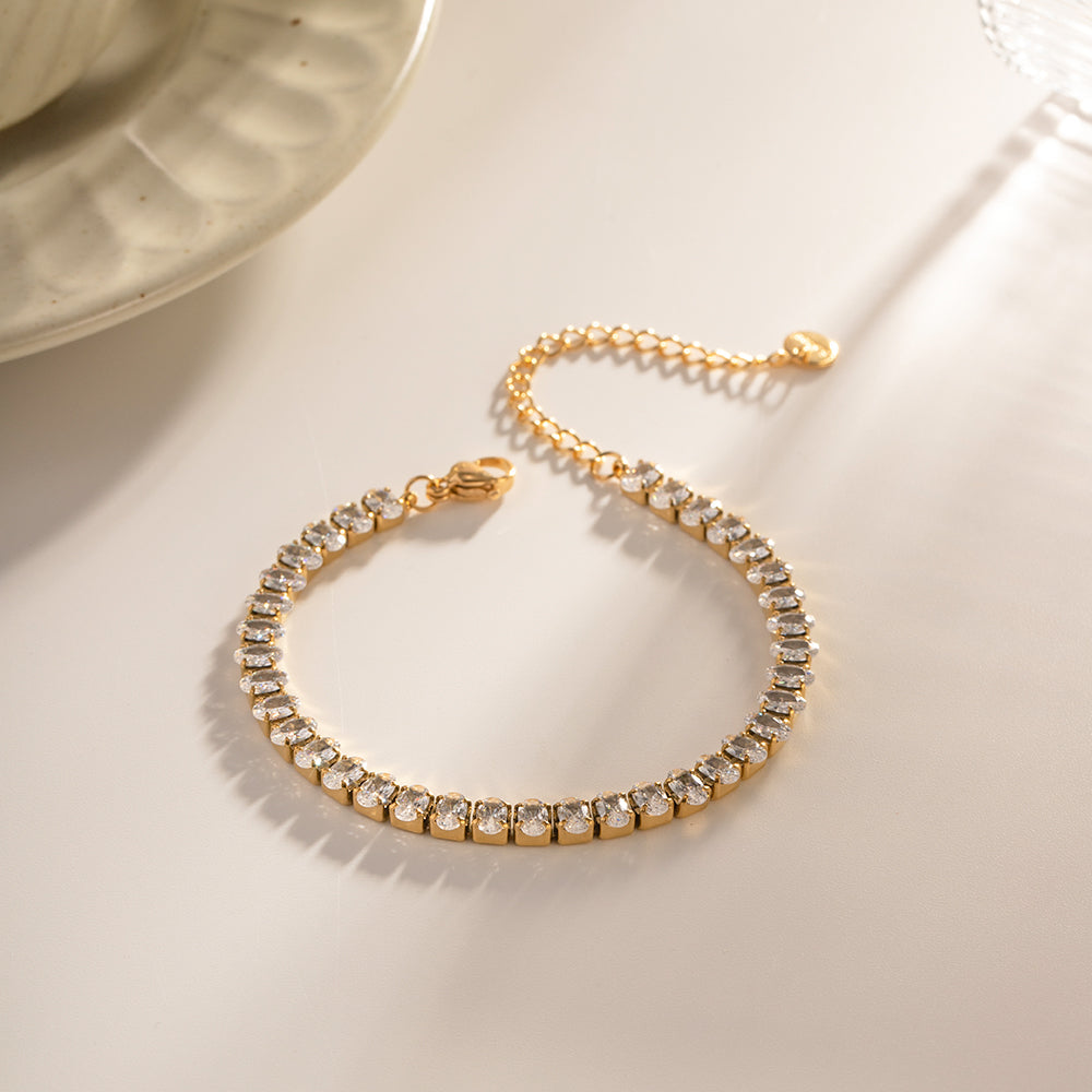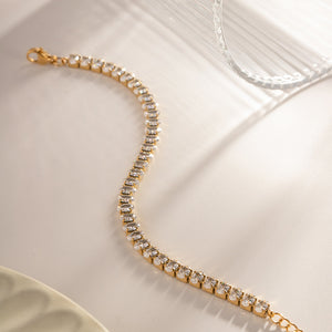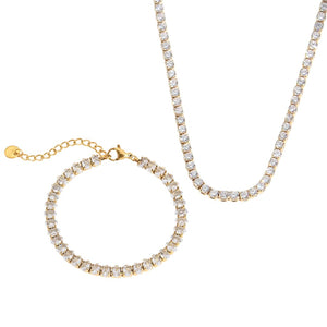 Elevate your elegance with the Tennis Spark Set. featuring a stunning bracelet and necklace combo. Crafted with 18k gold plating and adorned with shimmering zircon stones throughout. this set offers lasting brilliance. Designed to resist tarnish and waterproof for everyday wear. it combines luxury with durability. making it a top choice for those seeking timeless sophistication.