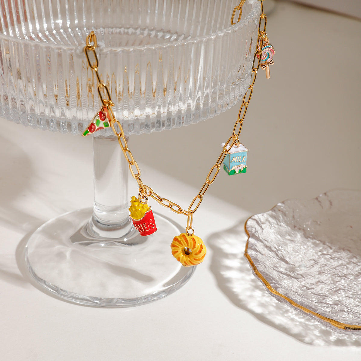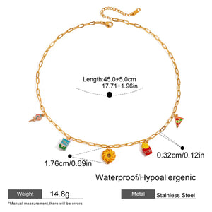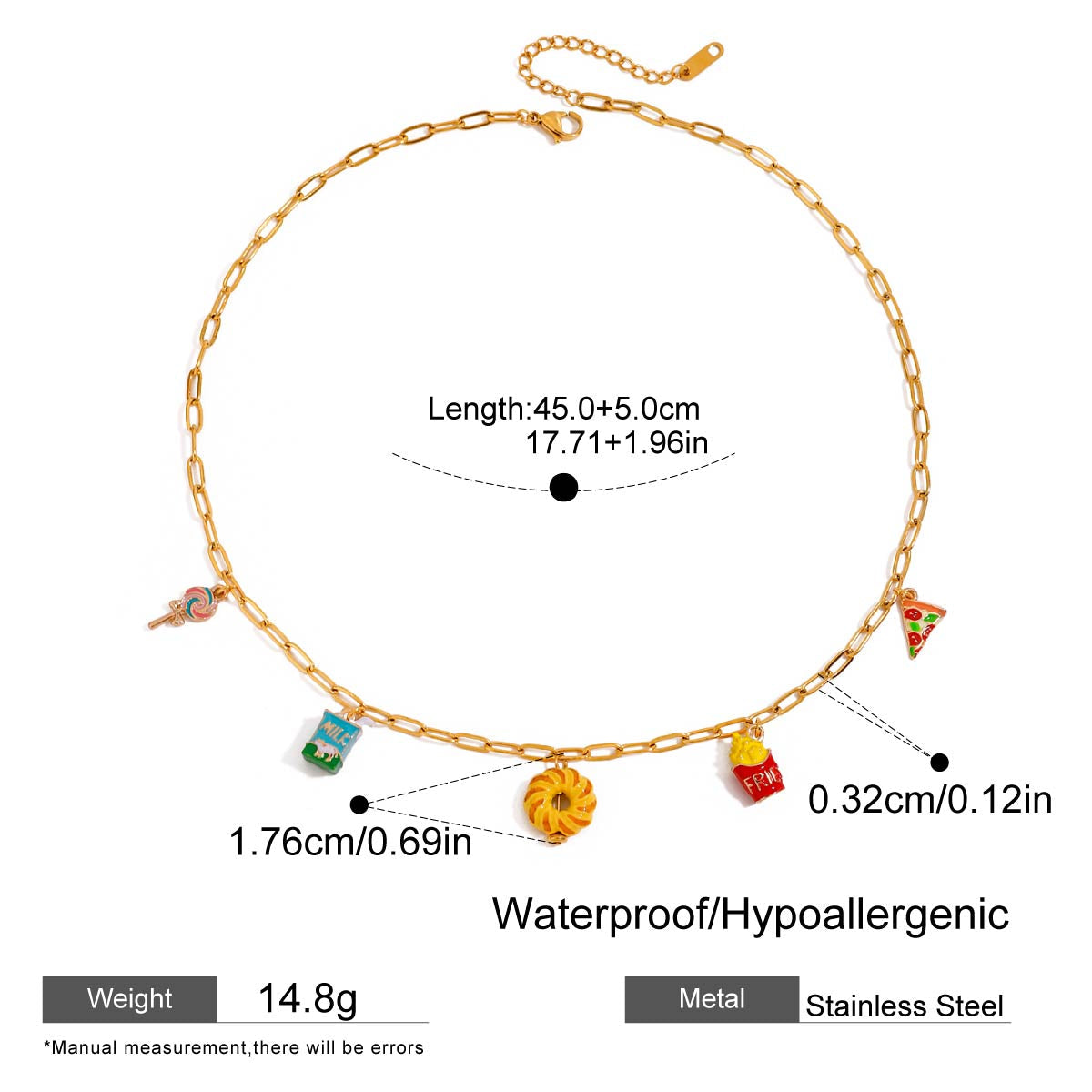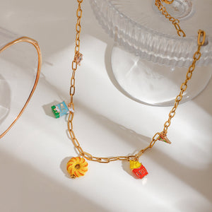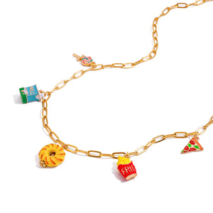 The Treat Yourself Necklace is a charming accessory for those who love to indulge. Adorned with lollipop. milk. donut. fries. and pizza charms. this necklace is perfect for the foodie in your life. Made with 18k gold plating. it is also anti-tarnish and waterproof. ensuring long-lasting wear.