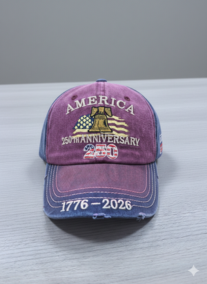 Celebrate 250 years of freedom with this America 250th Anniversary Hat. Featuring the Liberty Bell, American flag, and bold embroidered lettering, this vintage-style cap is the perfect way to show your patriotic pride for the U.S. Semiquincentennial (1776–2026).